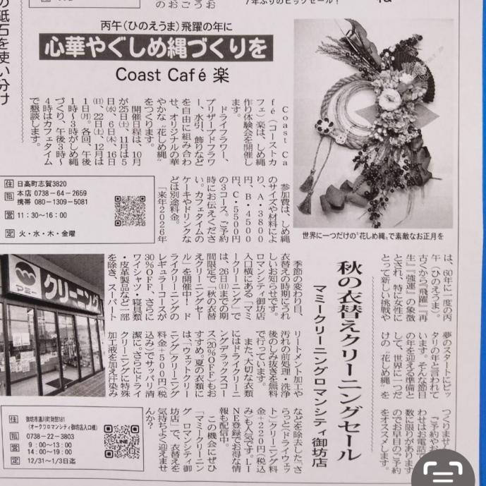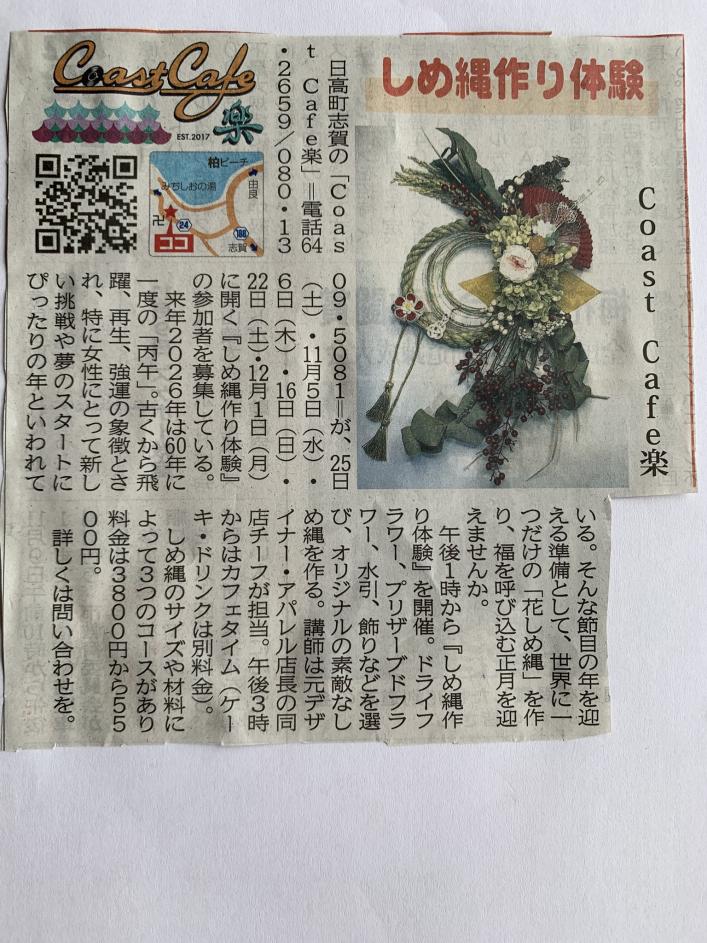 いつもCoast Café 楽/ゲストハウス・コーストカフェ楽をご愛顧いただき誠にありがとうございます。 しめ縄作り体験のご案内✨丙午(ひのえうま)飛躍の年に、心華やぐしめ縄づくりを✨来年 2026年は60年に一度の「丙午」。 しめ縄で皆様のお家をパワースポットにして、神様を快くお迎えしましょう。 当日は、由良湾を望むカフェで、コーヒーやケーキを楽しみながら 1. 費用 1)しめ縄のサイズや材料によって3つのコースがありますので御予約時に お伝えください A コース ¥3,800 B コース ¥4,500 C コース ¥5,500 2) ☕️カフェタイム(ケーキ・ドリンクは別途) コーヒー ¥600 ケーキセット ¥1,000 2.日程と時間 10/25(土)、11/5(水)、11/6(木)、11/16(日)、11/22(土) 12/1(月) しめ縄 13:00~15:00 カフェタイム 15:00~16:00(コーヒーを飲みながら懇談) 3.【体験内容】 ドライフラワー・プリザーブドフラワー・水引・飾りなどを自由に組み合わせ、 講師:当店チーフ(元デザイナー・アパレル店長) 「季節の花々が彩る、心に残るしめ縄アート」を丁寧にお手伝いします。 4.【お客様の声】 「可愛いパーツがたくさんあって、どれにしようか迷うのも楽しかった!」 「先生が優しくアドバイスしてくれて、想像以上の仕上がりに大満足」 「センスよく仕上げてもらえて、玄関に飾るのが今から楽しみです」 Aさん 可愛いパーツを色々と用意していただいたので、出来上がりも素敵になりました。先生も優しいし、人数的にもゆったりしていたので良かったです。 楽しかったです。ありがとうございました Bさん 大変華麗な可愛い仕上がりとなり大大満足しています。 自分がこうしたいというイメージを持って望めばもっとわかりやすくまた、早くに仕上がると思います。自分のイメージを先生がいいようにアドバイスしてくれるので、スムーズにできました。 Cさん 丁寧に教えていただき先生のナイスなセンスで私だけの素敵なしめ縄ができました。 Dさん 手作りの良さを実感できました。 事前の明瞭会計(オプションの小物の説明)はいいと思いました。 Eさん 華やかなしめ縄ができて明るく楽しい新年を迎えられそうです。 お喋りしながら楽しくできました。 ありがとうございました 。 -------------------------------- ご予約・お問い合わせ人数に限りがありますので、お早めのご予約をおすすめします。 Coast Café 楽/ゲストハウス・コーストカフェ楽 湯川克巳 新しい年を、心と暮らしを整えて迎える準備を。 10月18日(土)紀州新聞 ショッピング面掲載